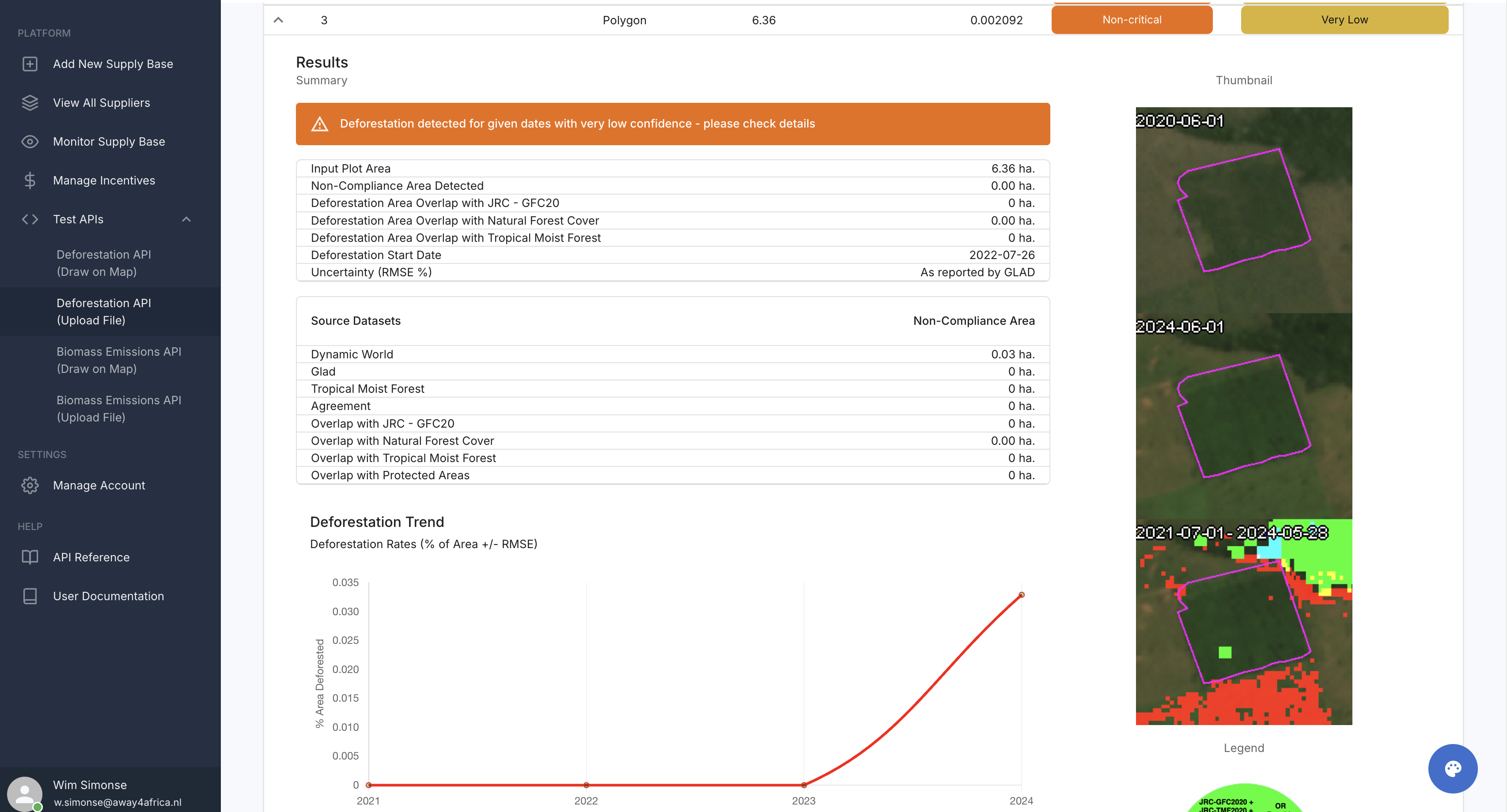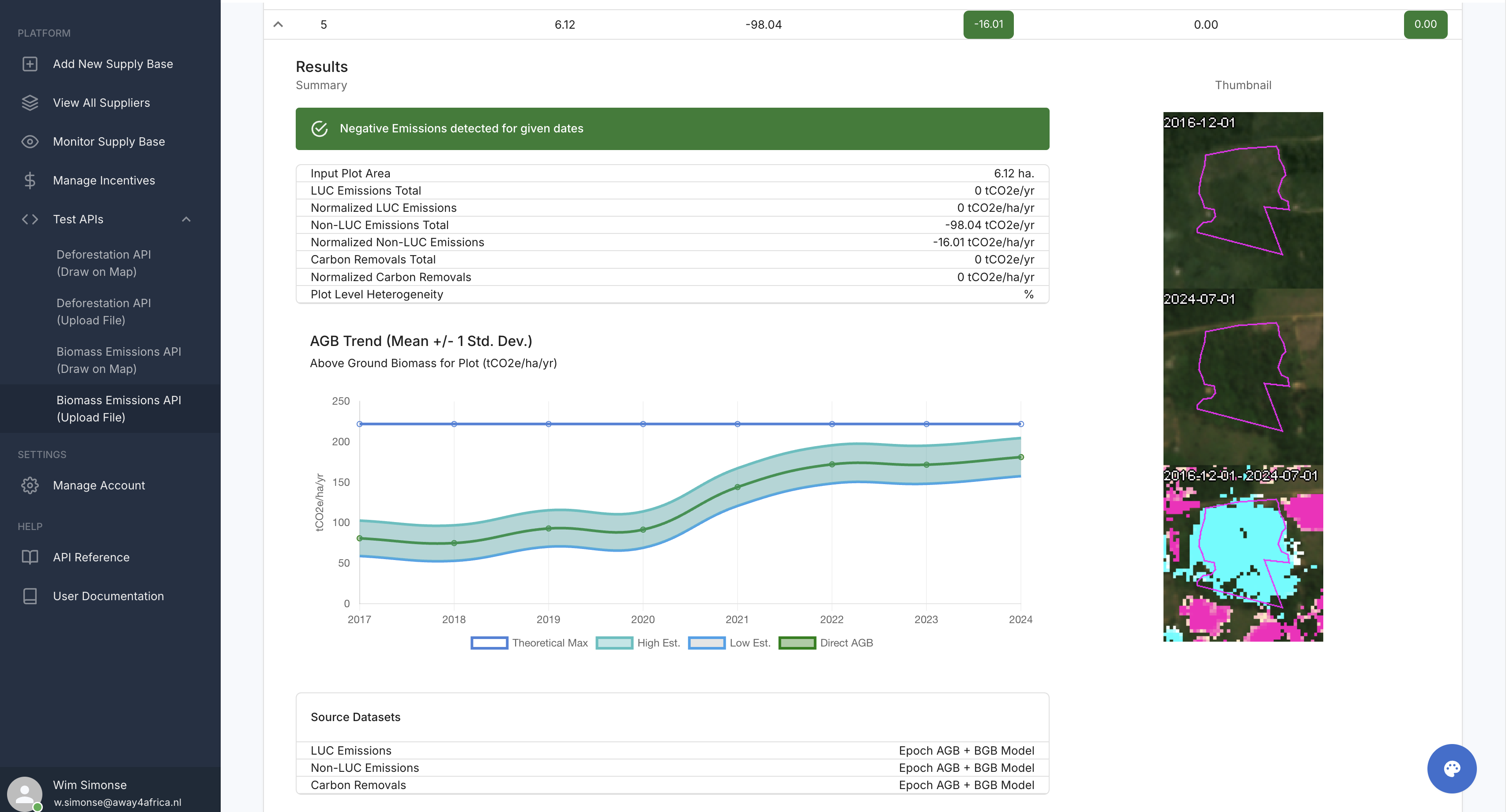 You can select either the deforestation endpoint or the biomass emissions endpoint. The deforestation endpoint will return the deforestation risk and EUDR compliance status for the plot for the time period provided, while the biomass emissions endpoint will return the annual biomass stock for the plot for the time period provided.