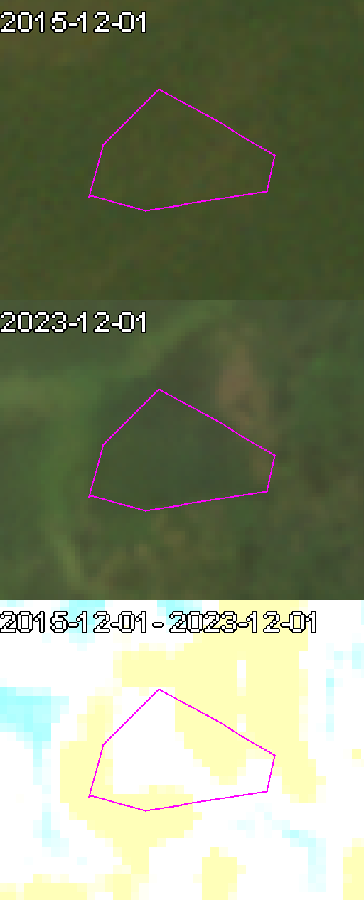 The top image is the situation at the start of the monitoring period, which defaults to 2016-01-01. The middle image is the situation at the end of the monitoring period, which defaults to the day the request is made. The image is always taken from the same time of the year in another year to the extent possible, as it ensures the season in which the images acquired are similar, making the vegetation conditions more comparable and the actual changes more visually appreciable.