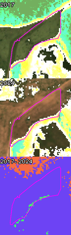 The top image is the situation at the start of the monitoring period, which defaults to 2017-01-01. The middle image is the situation at the end of the monitoring period, which defaults to the day the request is made. The image is always taken from the same time of the year in another year to the extent possible, as it ensures the season in which the images acquired are similar, making the vegetation conditions more comparable and the actual changes more visually appreciable.