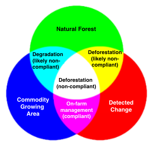 Color Combinations: When these layers overlap, the colors blend as expected: - Cyan (Blue + Green): Commodity presence overlapping with natural forest - Yellow (Red + Green): Forest change overlapping with natural forest baseline - Magenta (Red + Blue): Forest change overlapping with commodity areas (most critical for EUDR compliance) - White (Red + Blue + Green): All three layers overlap - forest change in commodity areas within natural forest
