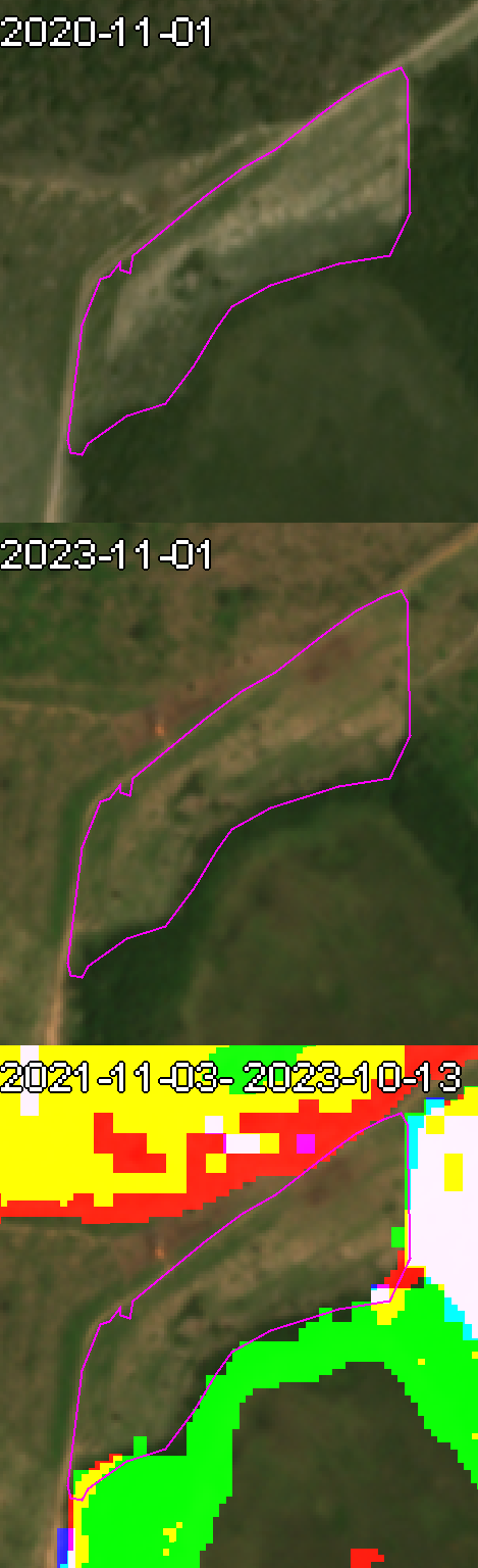 The top image is the situation before any change took place in the defined monitoring period. The middle image is the situation after the detected changes took place. The image is always taken from the same time of the year in another year to the extent possible, as it ensures the season in which the images acquired are similar, making the vegetation conditions more comparable and the actual changes more visually appreciable.