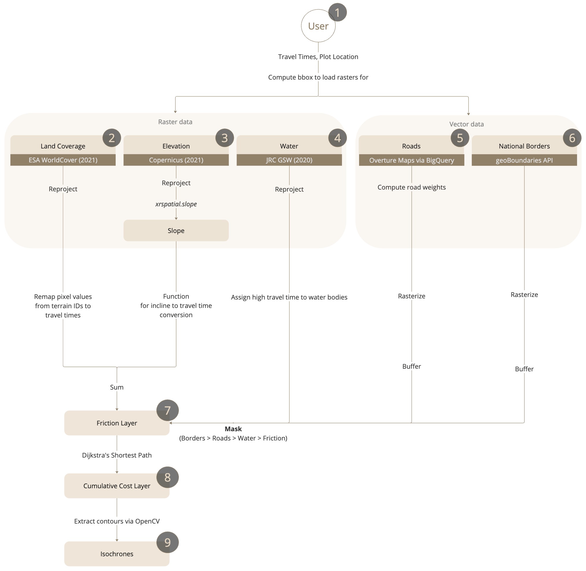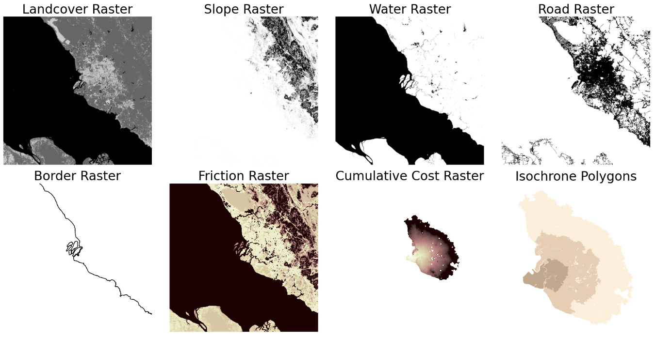 The idea is to merge multiple base rasters (water, elevation, landcover, road, border) into a 'cost' layer where each pixel represents travel time. This travel time is cumulated so that each pixel becomes the travel time relative to the defined starting pixel. This cumulative cost raster is thresholded by user-provided travel times to be vectorized into isochrones.