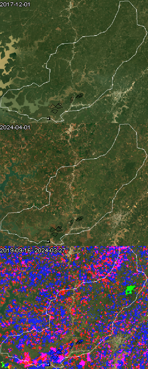 - Bottom Panel (Change Detection Overlay): Shows the color-coded overlay combining deforestation alerts, commodity presence, and natural forest baselines